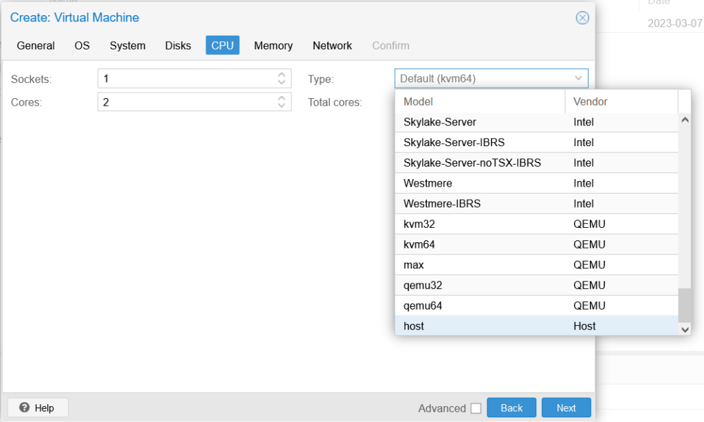 6. CPU kohdassa laita virtuaalikoneelle ainakin 2 corea ja vaihda Type “host”.