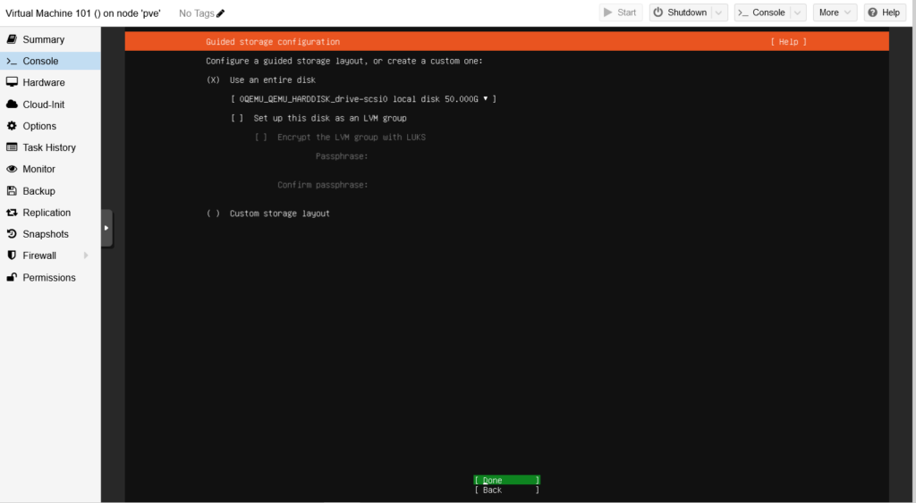 Poista “Set up this disk as LVM Group” rasti, koska emme tarvitse sitä. Sitten paina Done.
