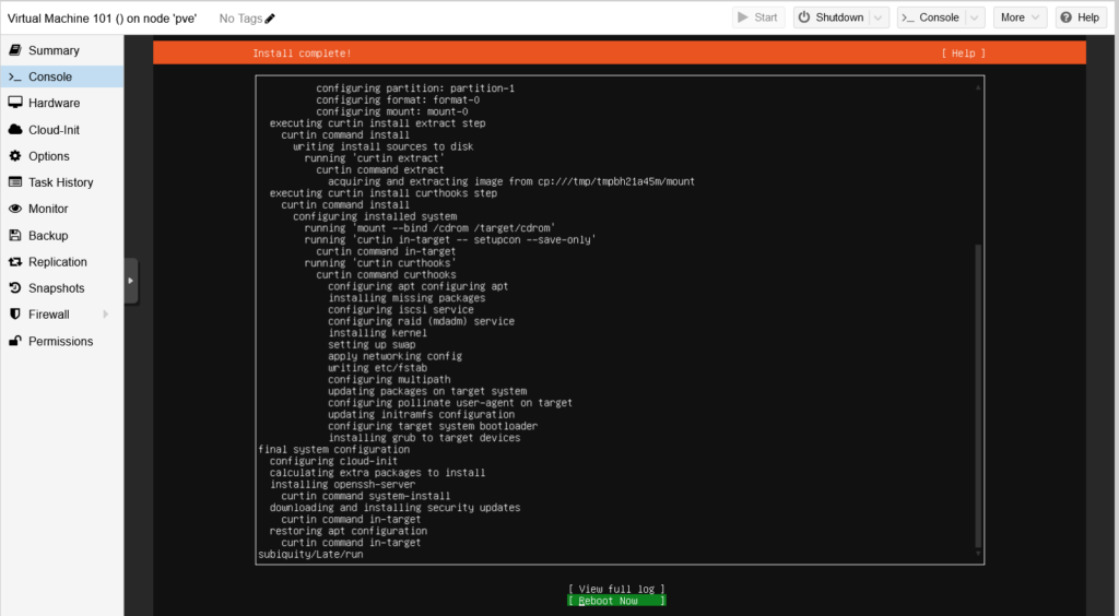 Odota että asennus valmistuu ja sitten paina “Reboot Now”